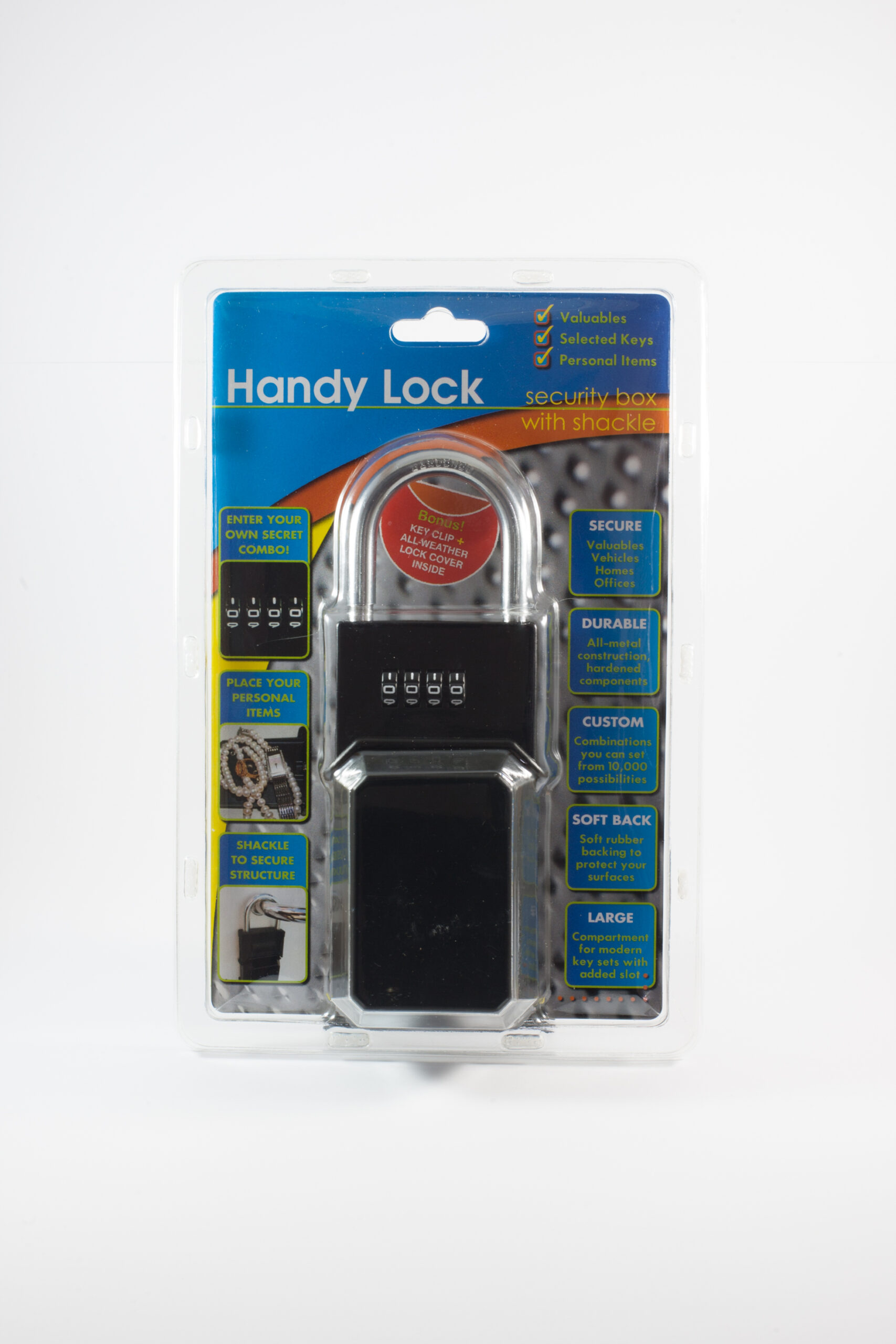 Handy Lock is a durable, all-metal combination padlock that can be easily secured inside or outside around homes or offices, or to vehicles, caravans, boats, trucks and trailers. Handy Lock works by a secret code to provide a safe and secure place to lock away your valuables and keys while you enjoy peace of mind.